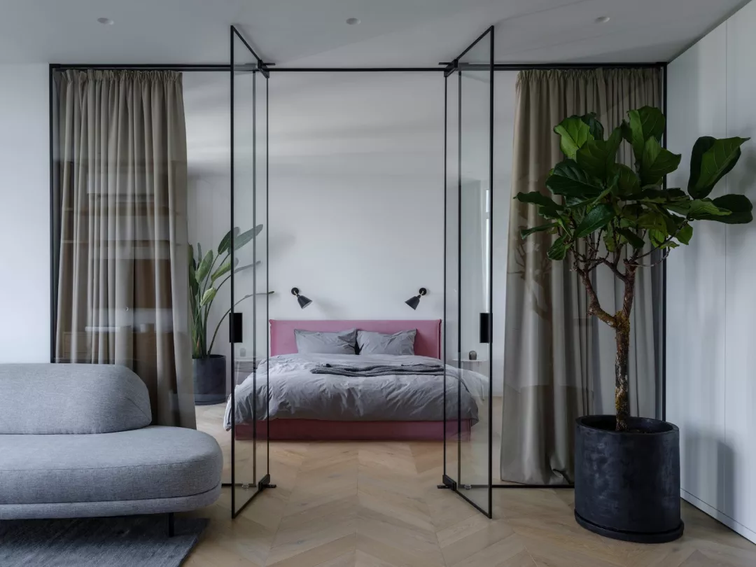 看看《小歡喜》里面宋倩的臥室,就是把整面墻都砸了,換成玻璃門,這樣的話就可以更大面積的促進(jìn)采光共享,而在晚上睡覺(jué)的時(shí)候又可以拉上窗簾增加空間的私密性。
