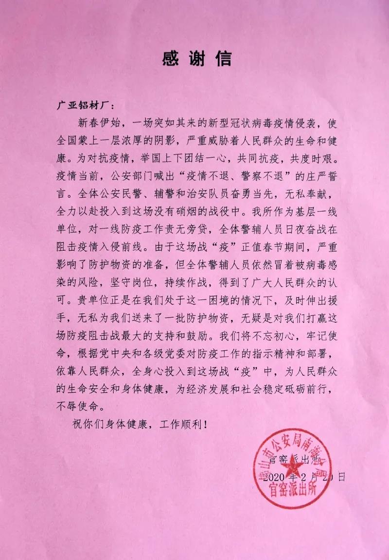 廣亞鋁業(yè)扎根官窯24年,一直與社區(qū)民警保持著良好警民關(guān)系。2月20日,集團(tuán)人力資源部左小平總經(jīng)理和廣亞生產(chǎn)基地行政部范衛(wèi)明經(jīng)理前往官窯派出所向一線民警贈送了一批防護(hù)口罩,表達(dá)了全體廣亞人在“戰(zhàn)疫”的特殊時刻,一片愛警、擁警的赤誠之心。