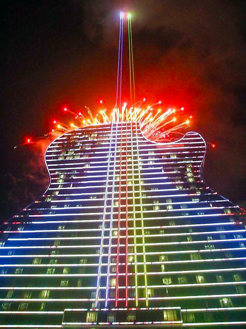 酒店按真吉他比例打造,擁有流動(dòng)吉他弧線立面,在“琴身”之上整齊排列著六根平行的琴弦。建筑頂部安裝的LED大炮組可將9.1公里的遠(yuǎn)程光束投向20000英尺深空,從而將“弦”無限延伸,成為完整的巨型“吉他”。