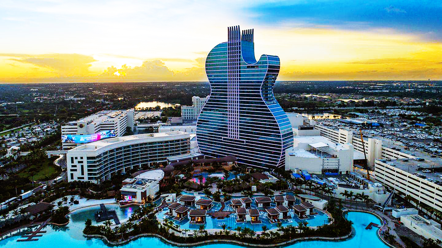 酒店位于佛羅里達(dá)州海濱城市好萊塢,已成為當(dāng)?shù)貥?biāo)志性建筑。酒店高約150米,擁有1271間豪華客房和套房,其中638間客房位于“吉他”的主音箱內(nèi)。酒店總造價(jià)高達(dá)15億美金。