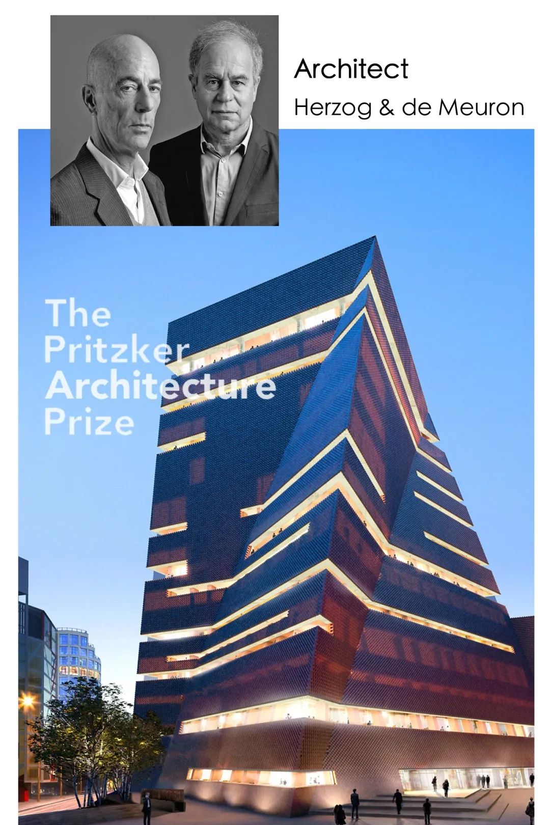 大廈整體建筑設(shè)計(jì)由普利茲克獎(Pritzker Prize,被譽(yù)為建筑界的“諾貝爾”)得主,瑞士著名建筑師赫爾佐格&德梅?。?/span>Herzog & de Meuron)執(zhí)筆。其代表作包括:北京奧運(yùn)會“鳥巢”、倫敦泰特現(xiàn)代美術(shù)館(Tate Modern,普利茲克獲獎作品)等。