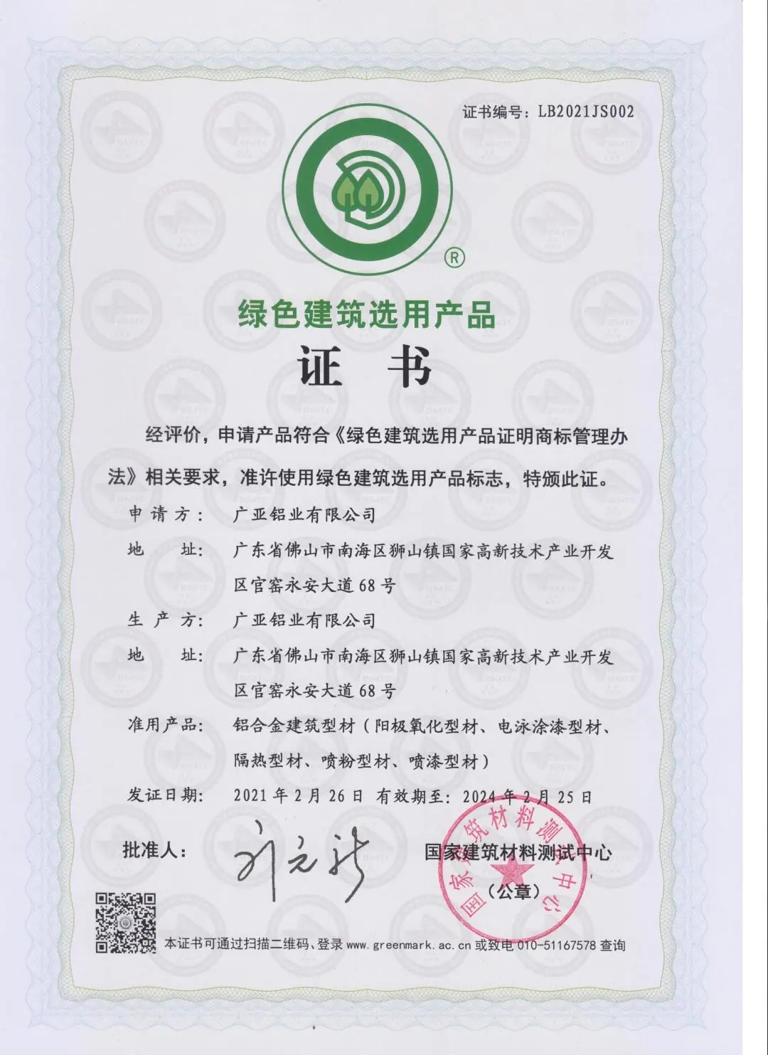 廣亞鋁業(yè)獲得此項認證,意味著響應(yīng)國家“十四五”規(guī)劃提出“加快推動綠色低碳發(fā)展”“發(fā)展綠色建筑”,大力發(fā)展綠色建筑是廣亞新階段適應(yīng)經(jīng)濟社會的轉(zhuǎn)型,智能制造方向的探索與轉(zhuǎn)型,用實