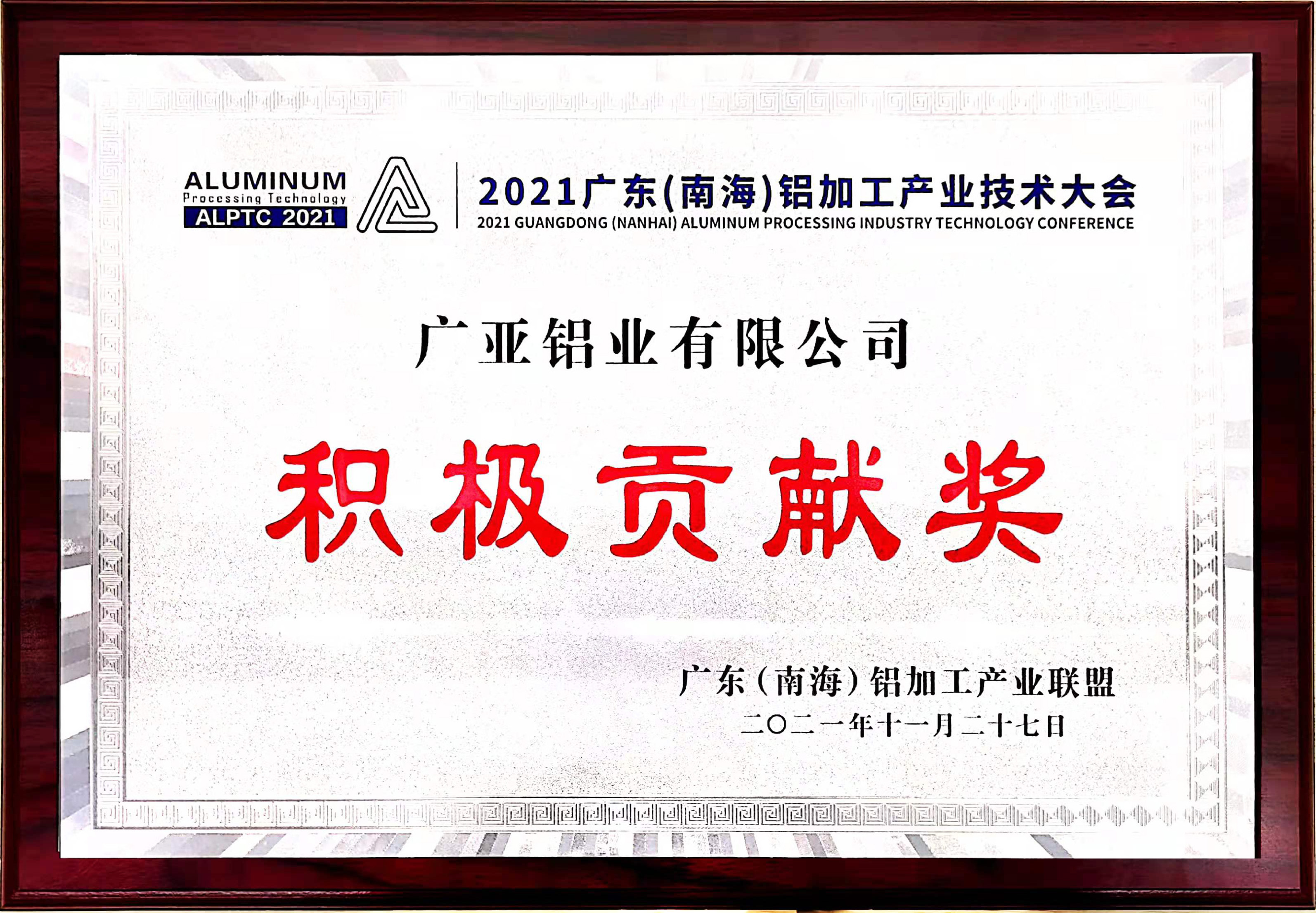2021廣東(南海)鋁加工產(chǎn)業(yè)技術(shù)大會(huì)盛大舉行,廣亞鋁業(yè)再獲“積極貢獻(xiàn)獎(jiǎng)”!