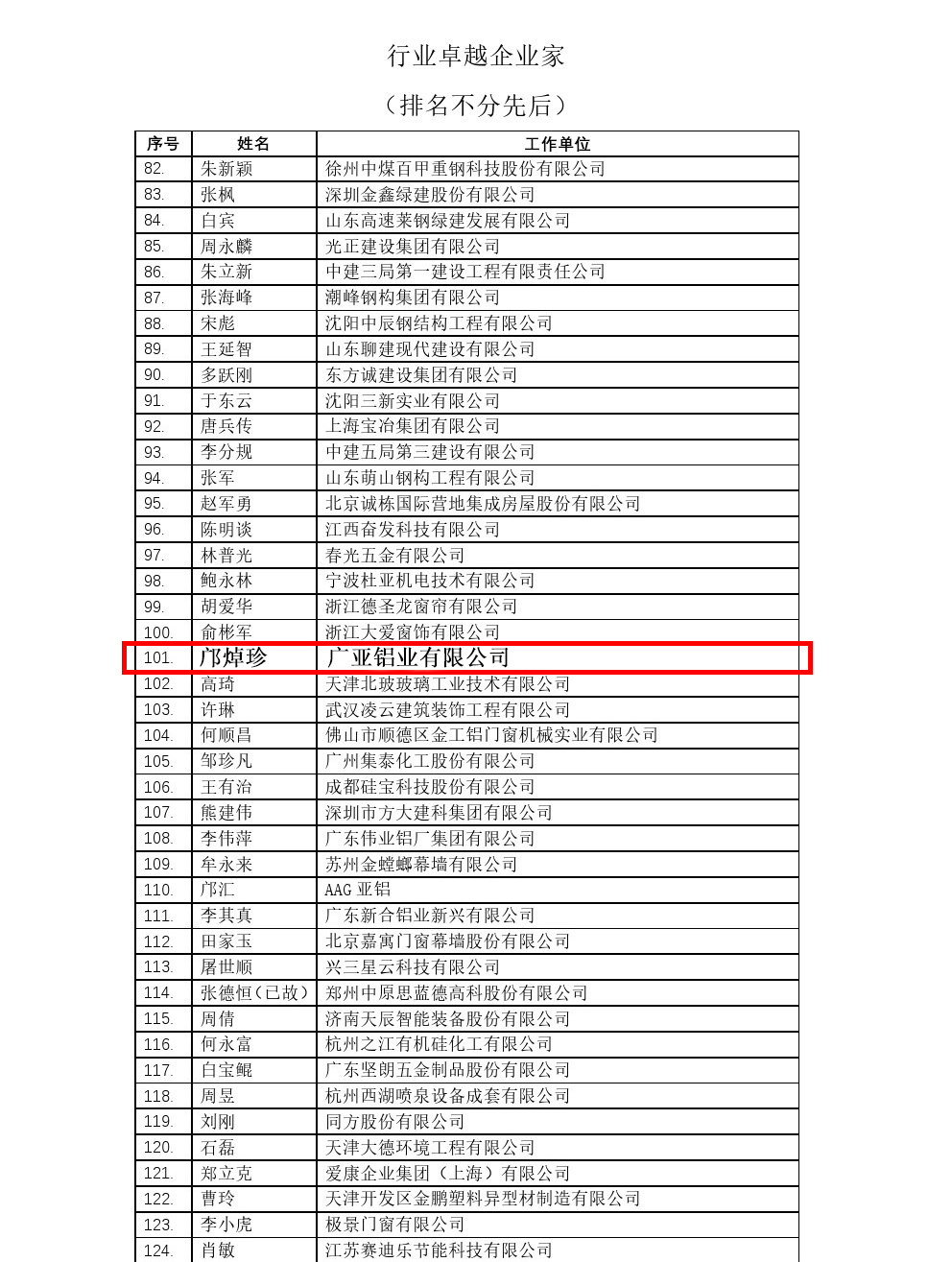 廣亞鋁業(yè)董事長(zhǎng)鄺焯珍憑借為促進(jìn)經(jīng)濟(jì)社會(huì)發(fā)展和提升行業(yè)競(jìng)爭(zhēng)力作出的重要貢獻(xiàn),榮獲“行業(yè)卓越企業(yè)家 ”稱號(hào)。