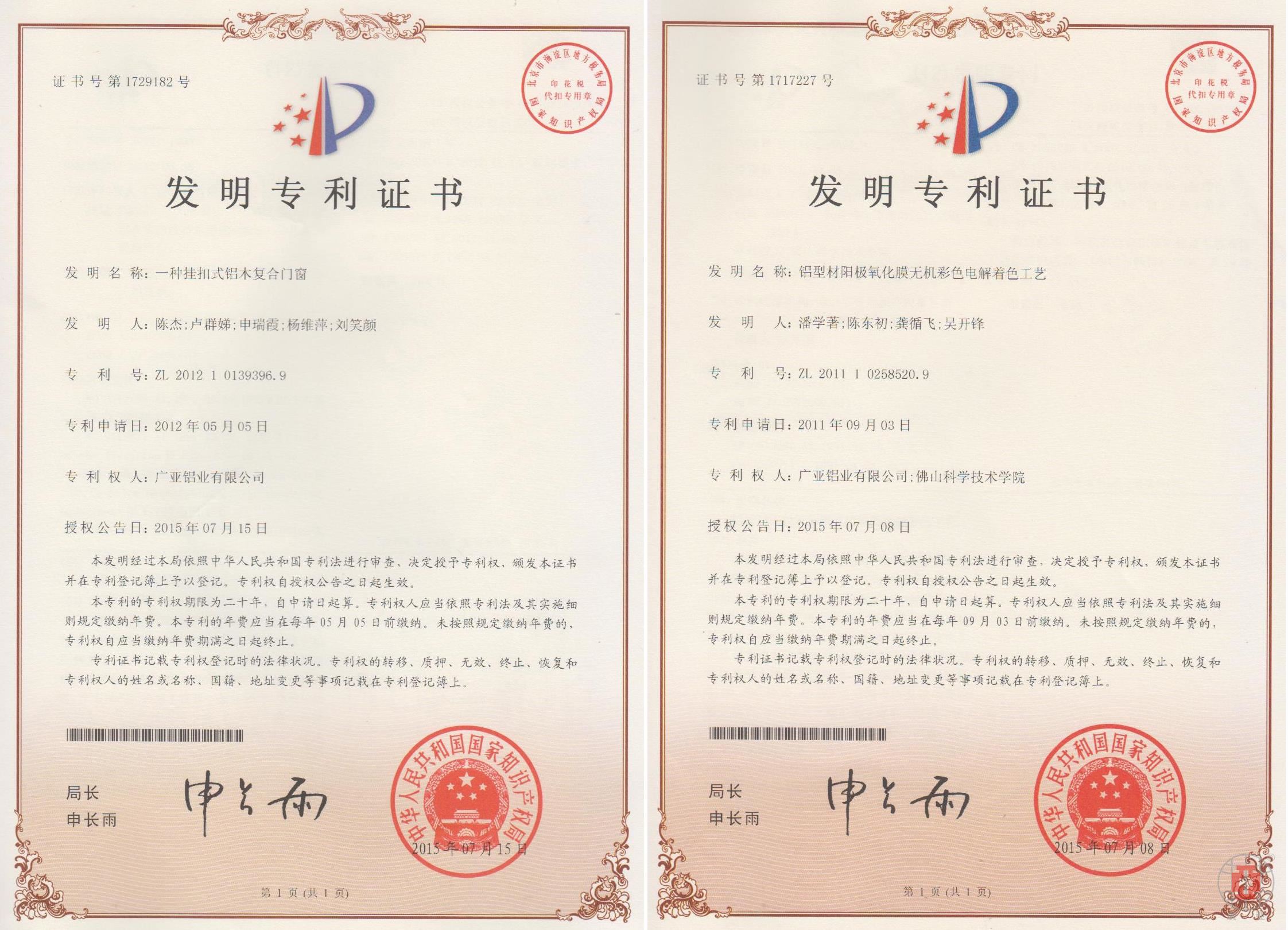 近期,在我司技術(shù)人員的不懈努力下,公司新增三項(xiàng)發(fā)明專利獲得國家知識(shí)產(chǎn)權(quán)局授權(quán),這三項(xiàng)發(fā)明專利分別是鋁型材陽極氧化膜 無機(jī)彩色電解著色工藝、一種掛扣式鋁木復(fù)合門窗、一種門窗型材及其安裝方法。截至目前,我司已取得國家專利授權(quán)228件,其中 發(fā)明專利4件,實(shí)用新型專利56件,外觀設(shè)計(jì)專利168件,具有很高的實(shí)用價(jià)值。