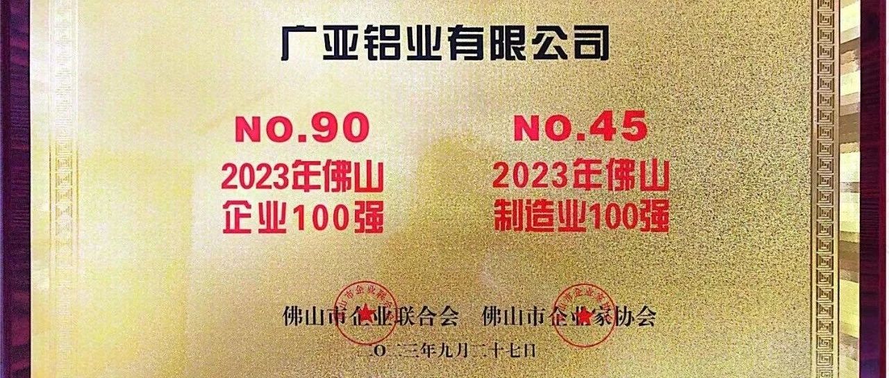 喜訊!|廣亞鋁業(yè)榮登“2023年佛山制造業(yè)企業(yè)100強(qiáng)”第45位、“2023年佛山企業(yè)100強(qiáng)”第90位